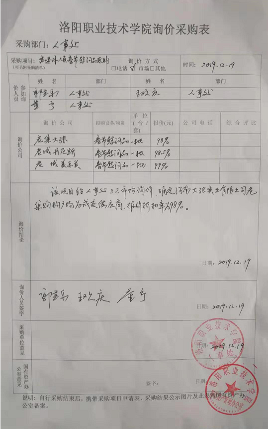 为做好2020年春节离退休人员慰问工作,人事处采用询价方式进行春节慰问品采购。询价公司三家:老集大张购物广场、老城区丹尼斯量贩和老城美乐美购物超市。老集大张购物广场折扣率为98%,确定为成交供货商。现将《洛阳职业技术学院询价采购表》进行公示。