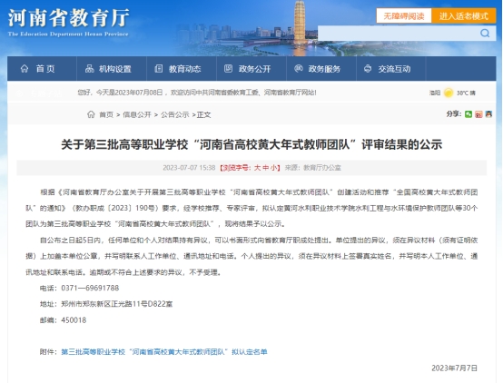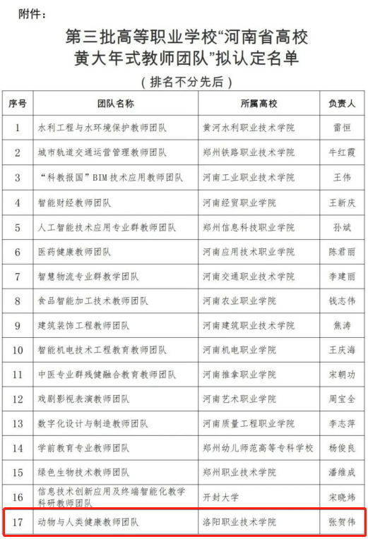 近日,河南省教育厅公布了第三批高等职业学校“河南省高校黄大年式教师团队”,我校食品与药品学院“动物与人类健康教师团队”成功入选。