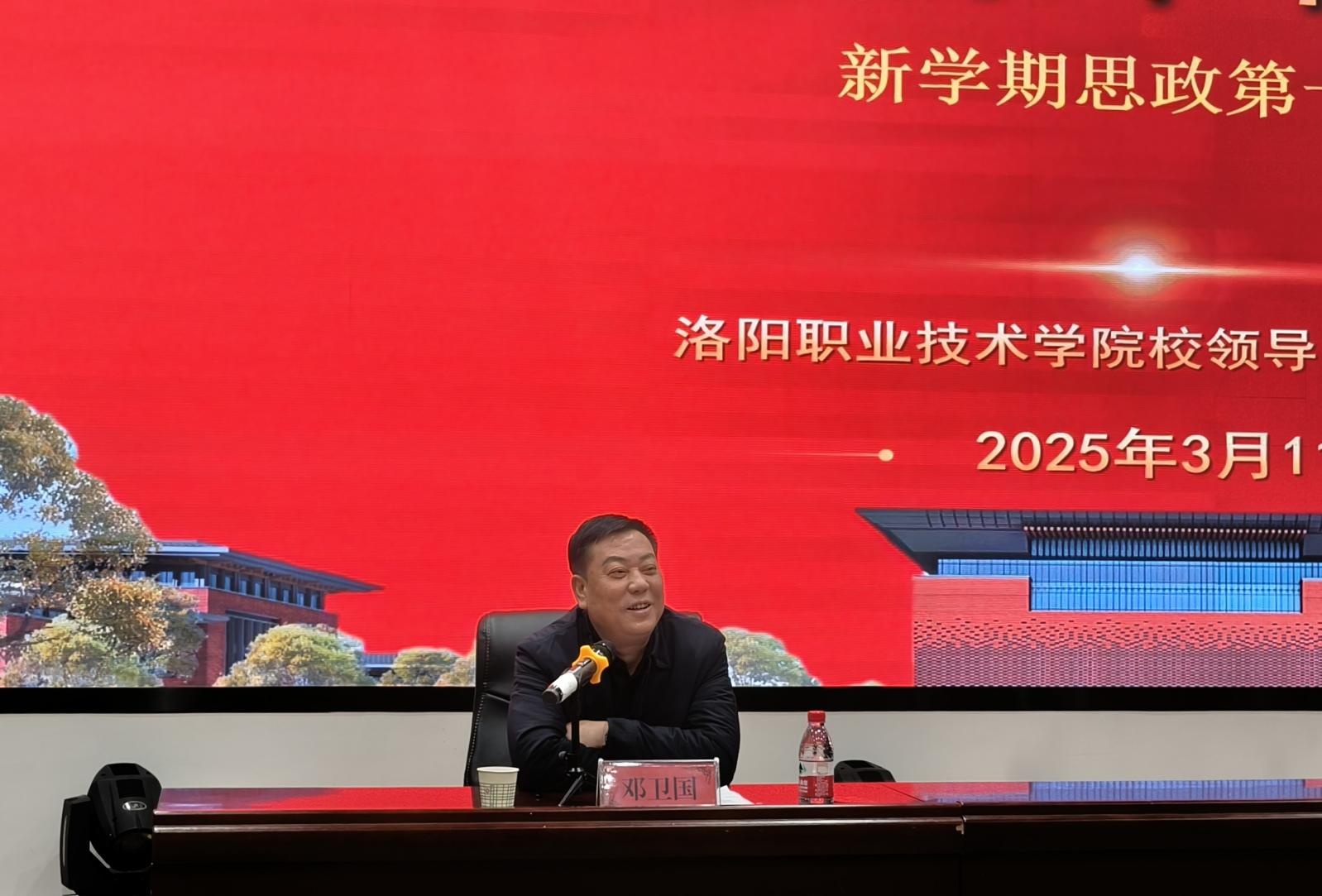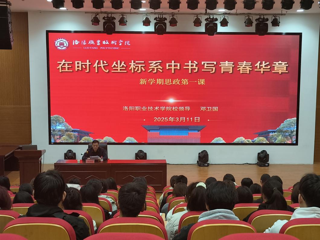 在2025年春季开学不久,洛阳职业技术学院校领导、校关工委执行主任邓卫国于3月11日上午,在大学生活动中心二楼心理剧场为基础医学院24级学生讲授新学期“思政第一课”。基础医学院党总支书记崔颜宏、副书记李笑雯,团总支书记翟一帆和部分辅导员及24级大学生代表近200人参加。